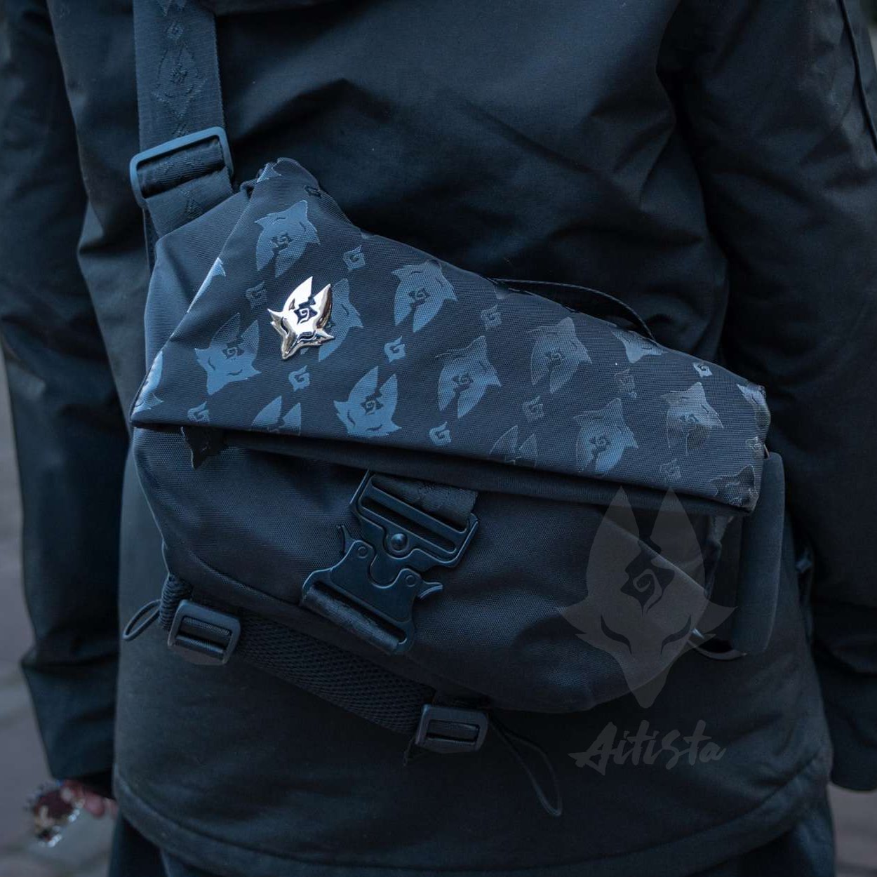 Chest bag featuring Aitista's logo patterned on the flap with a silver emblem